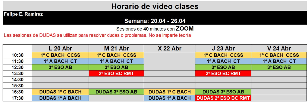 La próxima semana tendremos sesiones de video clases según el horario indicado. El alumno recibirá con anterioridad y oportunamente la invitación a la sesión con Zoom.