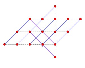 Entre todas las posibilidades hay que tener cuidado en lo que el McCormitt interpreta como fila: si para él fila es un segmento que pasa por tres puntos (dos puntos siempre determinan un único segmento), hay algunas soluciones que no le servirían al sargento. En las dos últimas configuraciones aparecen varias ternas de puntos alineados que se han dibujado en azul y morado y línea continua, lo que podría hacer que el siempre malhumorado sargento reprendiera al poco afortunado soldado Smith.