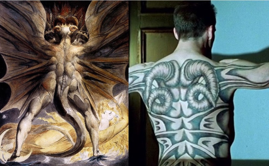 La acuarela “El Gran Dragón Rojo y la Mujer revestida en el Sol” de dicha colección es la inspiración del tatuaje y la obsesión del atormentado e inestable asesino de la película El dragón rojo inspirada a su vez en la novela homónima de Thomas Harris; una de las películas de la serie de secuelas inspiradas en la historia de Hannibal Lecter (El silencio de los corderos, J. Denme). Será que Blake conocía el infierno mejor que nadie.