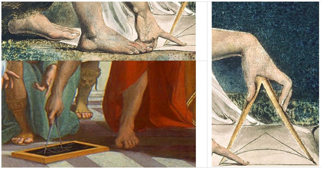 Compárense la ubicación del pergamino y de la pizarra, de ambos compases, pero, sobre todo, obsérvese como ambos genios cogen el compás exactamente de la misma forma: la mano de Euclides en un escorzo y la de Blake en paralelo al observador; pero la posición de los dedos es la misma. Si Blake no se inspiró en la Escuela para representar a Newton, entonces es que estudió a la perfección como se emplea y sujeta un compás.