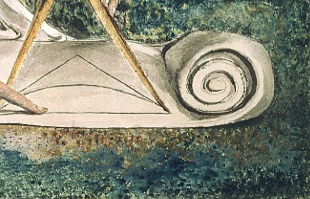 El universo sobre el que discurre Newton, es un pliego arrollado en sí mismo que adopta, por tanto, la forma de la elegante espiral arquimediana, que a su vez nos recuerda las volutas del orden jónico y por qué no, a las formas de las caracolas del mágico espacio natural del cuadro.